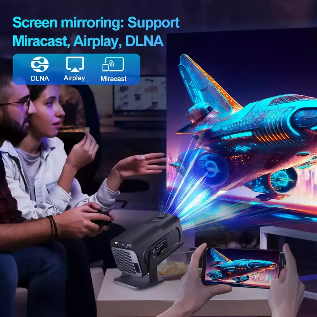 O projetor usa tecnologia WiFi 6 líder do setor, a transmissão é mais rápida e estável, desfrute de uma experiência de visualização e jogo suave!Você pode espelhar a tela sem fio através de Miracast e Airplay