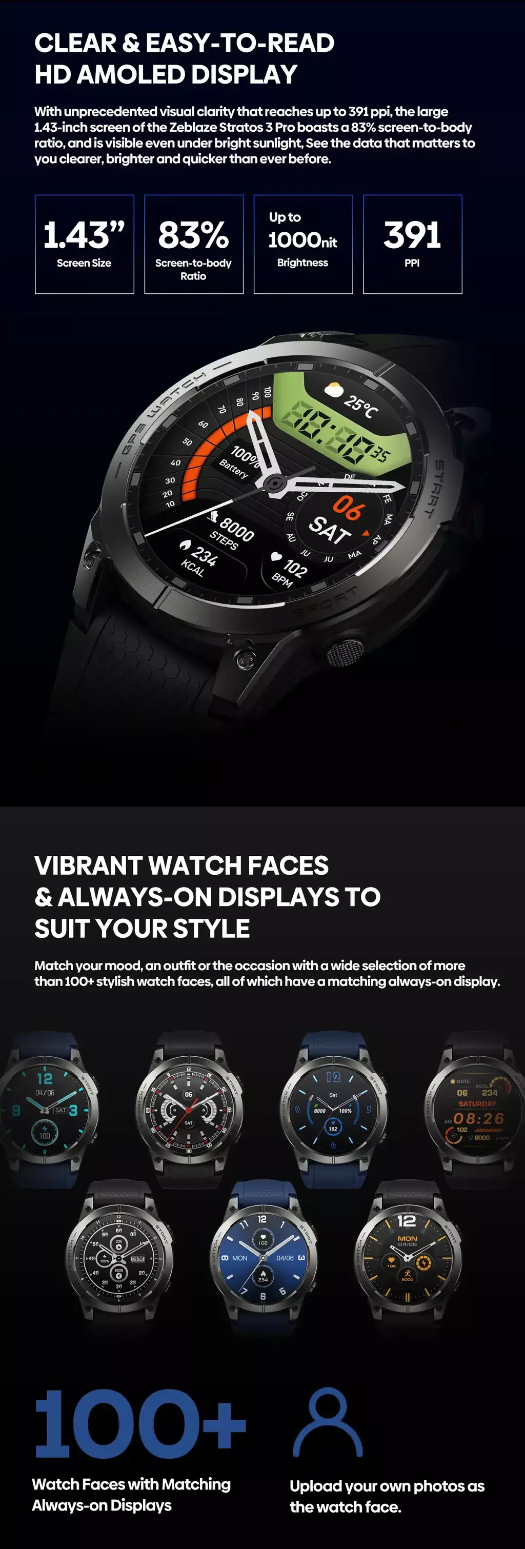?Display HD AMOLED claro e fácil de ler?Com clareza visual sem precedentes que atinge até 391 ppi, a grande tela de 1,43 polegadas do Zeblaze Stratos 3 Pro possui uma proporção tela-corpo de 83% e é visível mesmo sob luz solar intensa.Veja os dados que importam para você com mais clareza, brilho e rapidez do que nunca.