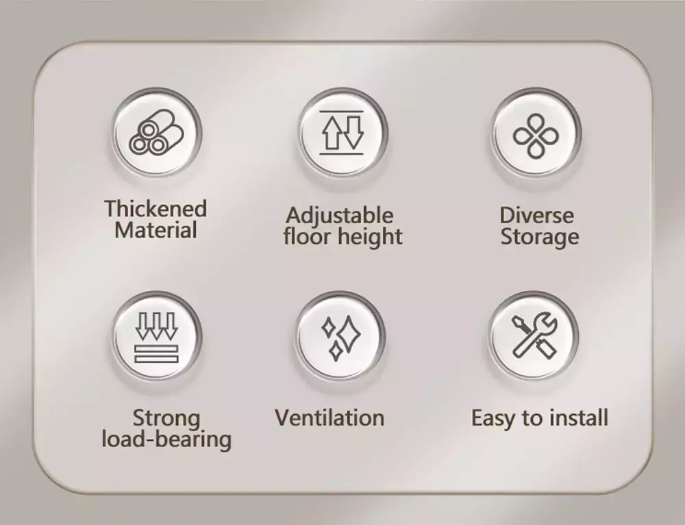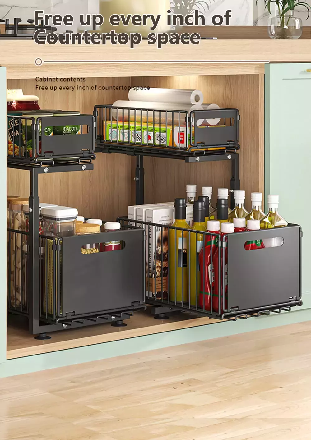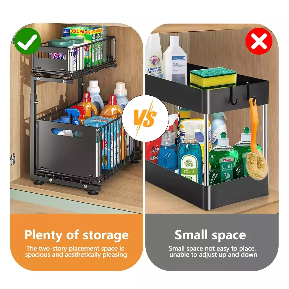 ?Armazenamento de grande capacidade?Armazenamento de 2 camadas, com a camada superior armazenando pequenos itens como garrafas curtas ou panos, e a camada inferior armazenando garrafas altas e objetos grandes para evitar que as garrafas caiam.