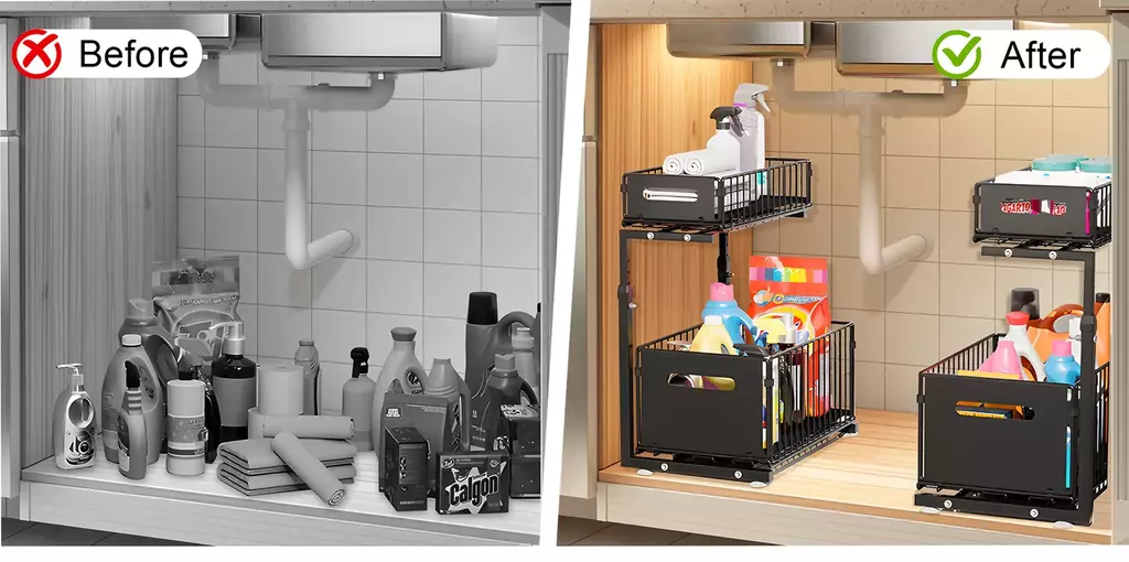 ?Uso versátil?O organizador embaixo da pia é perfeito para conter e organizar itens soltos e mantê-los arrumados.É um ótimo organizador de armário deslizante para armários, cozinha, despensa, banheiro, sala de estar, escritório e muito mais