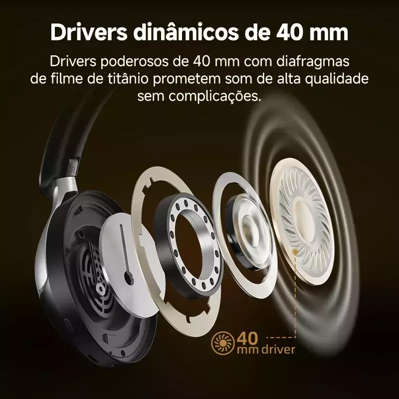Potentes drivers de 40 mm com diafragmas de filme de titânio prometem som de alta qualidade sem qualquer problema.De graves precisos com uma assinatura de som quente a agudos nítidos e limpos, ouça cada batida e cada camada com clareza.