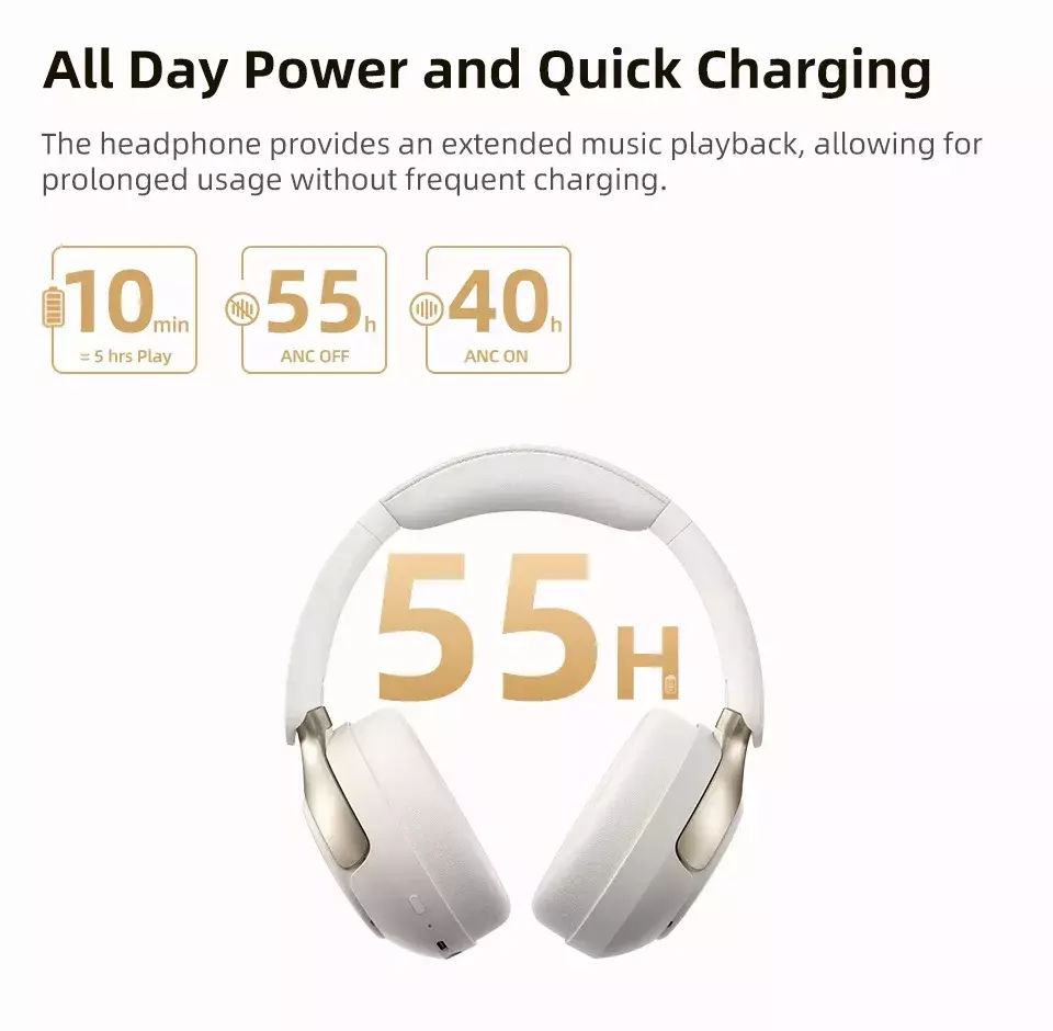 Espuma ultramacia / Faixa de cabeça ajustável / Design de alívio de pressão / Fones de ouvido giratórios.Carregamento rápido e duração da bateria de 55 horas