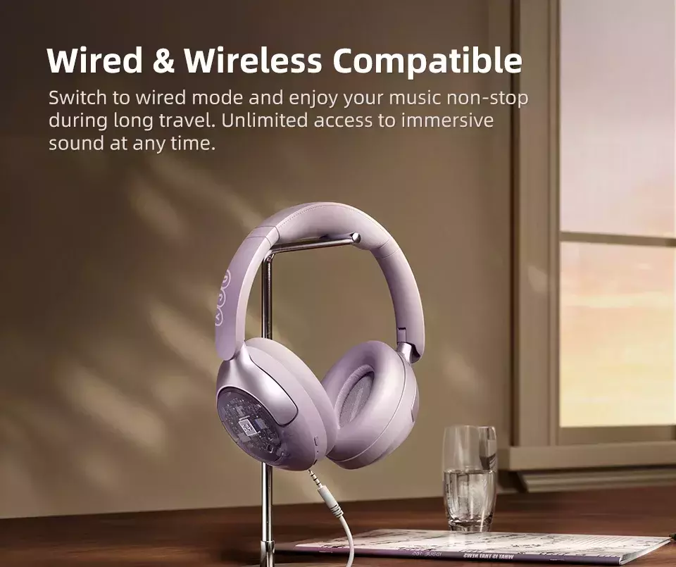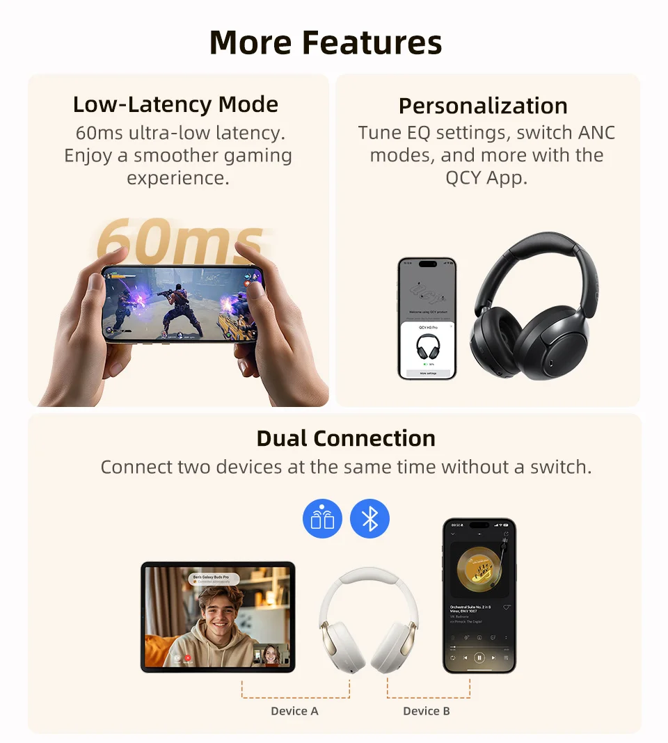 Além da conexão sem fio Bluetooth 5.4 estável e rápida, o QCY H3 Pro também vem com um cabo Aux de 3,5 mm para conexão com fio.Modo Bluetooth 5.4 e 65ms de baixa latência